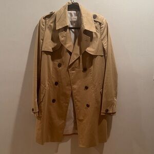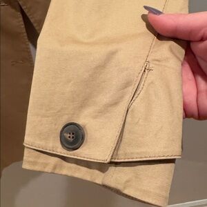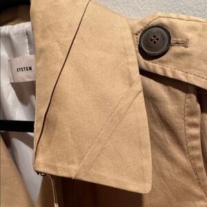Stylish double-breasted trench coat by System. Features classic tan color and button details. Beautiful layered fabric details along the collar, pockets and sleeves. Hand stitched details on the back. Such a unique and beautifully crafted trench coat. Tag lists the measurements. 17” ptp, 34” long, 16” waist. Fits like a XS-small Ideal for versatile wear. Great condition