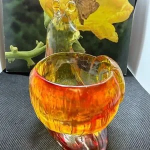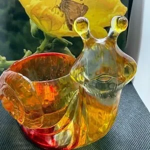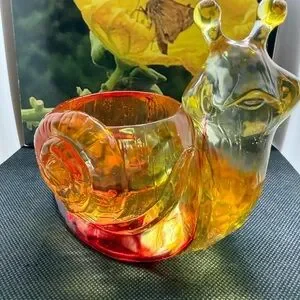Add a touch of whimsy to your home with this vibrant glass snail sculpture. Featuring a stunning blend of red, orange, and yellow hues, this piece is perfect for art lovers. Made with resin.