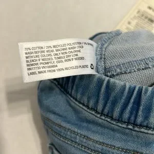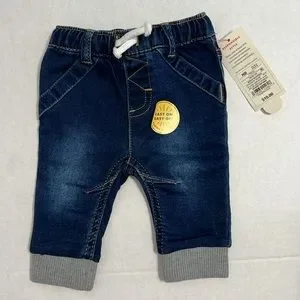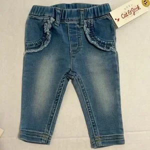 Two pairs of pull-on soft and stretchy jeans. Medium wash with knit cuffs and drawstring waist. Lighter wash with ruffle details on the pockets. Combined retail value of $20. NWT both size NB or newborn.