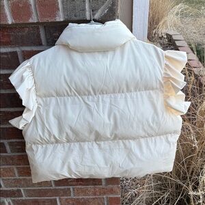 Chic ivory puffer vest with unique ruffle sleeves. Ideal for layering.