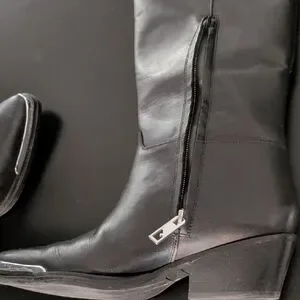 Chic knee high boots have been worn a few times. Well taken care of and weatherproofed. Silver accent on the toe makes it a classic style.