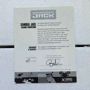 The Samurai Jack Training Progression Maquette is a set is 3 separate statues that may be displayed together or independently. Created by Genndy Tartakovsky for the Samurai Jack Animation series, the statue stands approximately 7" tall and is sealed in styrofoam in its original box. This set shows Jack as he progresses through his training from his young life into adulthood. Limited to 2500 pieces, the Certificate of Authenticity is marked 0399/2500. Box and figure have slight imperfections (see photos).