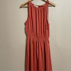 A halter neck sleeveless midi dress with a smocked waistline.