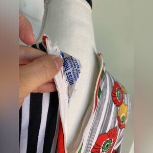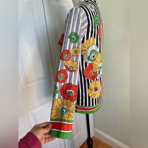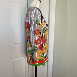 From the colors to the design pattern this top by Miss Holly is both very 70s but with colors that make it work for today. It is a stunner and has the most darling little zipper pull. It is made of polyester and in great vintage condition with the exception of a pin-sized stain I have not attempted to remove and one other small spot as pictured.