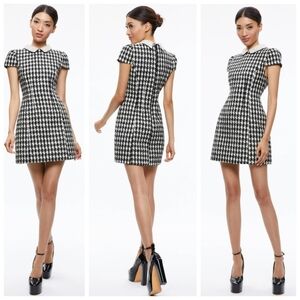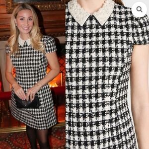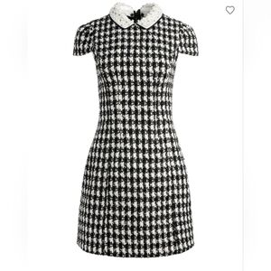 The product is a stylish Alice + Olivia Velia Tweed Mini Dress in a sophisticated black color with a crystal pearl collar. This dress features short sleeves, a zip closure, and is designed in a mini length, making it a trendy and flattering option for women size 6 new with tags. The tweed fabric adds a touch of texture and sophistication to the overall look, making it a perfect choice for a special occasion or a night out. in excellent conditions.