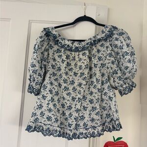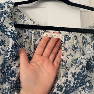 Worn a few times, some staining inside but not notable from the outside. Gorgeous Doen top with soft fabric and beautiful eyelet detailing. I love this blouse but it’s a bit too big for me