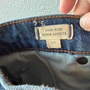 The High Rise Denim Shorts in medium blue wash. Cutoff hems. 3.5” inseam. 98% cotton 2% elastane. In great shape, gently used. No rips or stains.