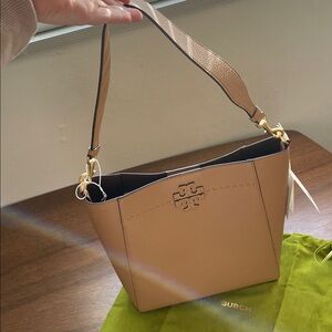 Brand new with tags. Tory Burch Mcgraw Bucket Bag. ONE SIZE. Color: Tiramisu. Comes with green dust bag. Pet and smoke free home.