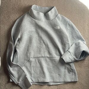 Light gray sweatshirt by The North Face. Features high collar and front pocket. Comfortable and stylish.
