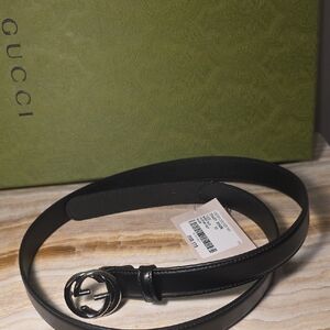 Elegant black leather belt. Features iconic silver buckle. Perfect for any outfit.