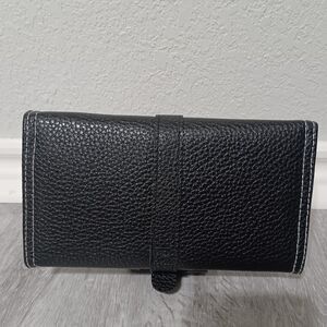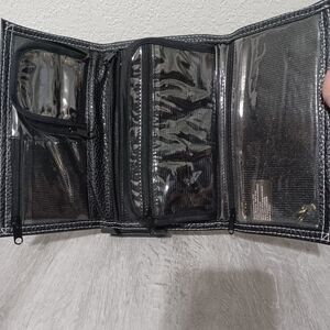 PREZERVE black vinyl jewelry pouch with silver hardware, a ring/snap closure, 6 clear pockets of varying sizes, two ring rolls with snap closures, and a zippered section in the center