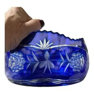 Vintage Cobalt Blue Cut Crystal Bowl Bohemian Style Floral Overlay Heavy Glass