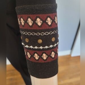 Vneck jumpsuit that crosses over to the waist. Fastens with a snap at the bust. Elasticated waist and tapered legs. Floral and tribal contrast prints at neck, and embroidered and rivet details at cuffs.