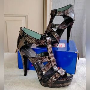 Chic strappy Nine West heels with a bold pattern. Perfect for a night out. Only damage visible is on the sole of the shoe (shown above) completely covered while being worn.
