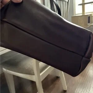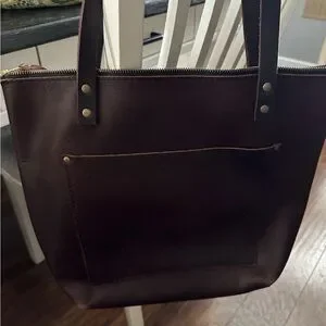 Chic dark brown leather tote. Features sturdy handles and front pocket. Ideal for daily use.
