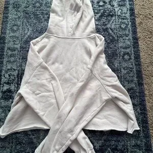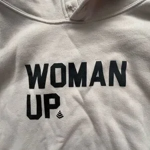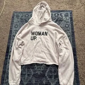Elevate your casual wardrobe with this chic cream cropped hoodie featuring a bold 'Woman Up' print. Perfect for layering and making a statement. I believe that this could fit a medium or large in women’s sizing. Not sure of exact brand as well:)