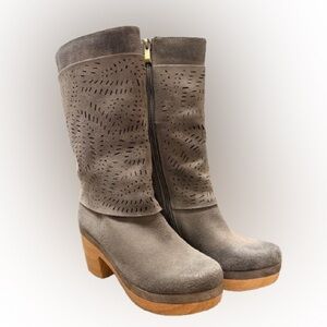 They feature a brownish suede upper with intricate laser-cut perforations, a side zipper, and a light-toned wooden clog heel and platform.