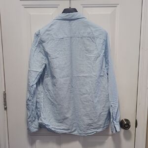 Light blue shirt by Calvin Klein. Features button-down style and chest pockets. Perfect for casual occasions.