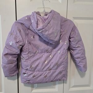 Cozy purple jacket with shiny star pattern. Features a hood and front zipper. Perfect for chilly days.