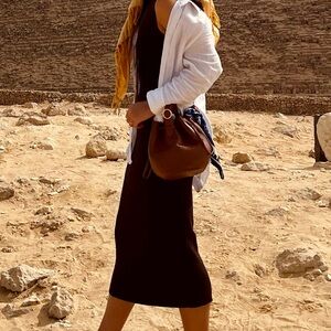 Crafted from pebbled leather, it features a classic drawstring closure, a detachable shoulder strap for versatile wear, and comes with the original dust bag. Compact yet spacious enough for your essentials.