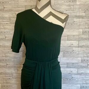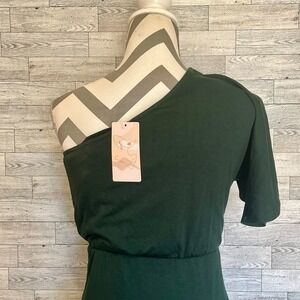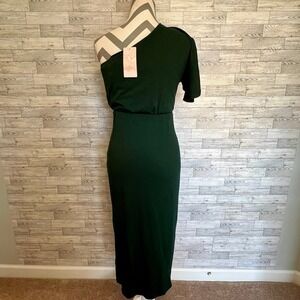 Fashion Womens Small Dark Green One Shoulder Midi Dress Ruched Waist NEW Tags