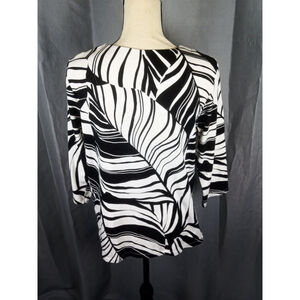 This Alfred Dunner women's 3/4 length-sleeve tee features a striking black and white abstract pattern, resembling stylized leaves or waves. It has a notched V-neckline adorned with small silver stud embellishments. The garment is made from a blend of 95% cotton and 5% spandex, offering a comfortable stretch. The tag indicates it is a size S. The sleeves appear to be 3/4 length. The top is in good pre-owned condition with no significant visible flaws.