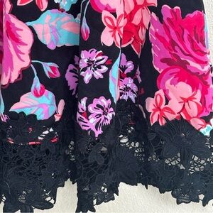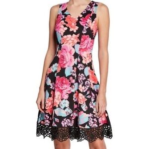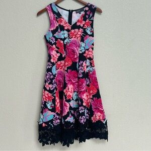Donna Ricco New York Floral Sleeveless Fit & Flare Dress Size 4 Black Pink Multicolor with Lace Hem
