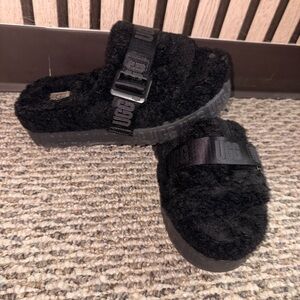 Soft and plush UGG slippers for kids. Fluffy black design with secure strap. Perfect for cozy wear.