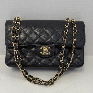 This Chanel shoulder bag showcases a luxurious black quilted design with elegant gold-tone hardware. The iconic CC turn-lock closure and interwoven chain strap add a touch of sophistication, making it a timeless accessory for any occasion.