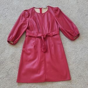 Elegant red dress with puff sleeves. Features a stylish belt. Perfect for formal occasions.