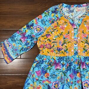 John Mark Women's Plus Size 3X Blue Floral Print Embroidered Dress, 55% Rayon 45% Viscose, No Stretch, Pockets, Unlined, Partial Button Front, Cinched Sleeves with Tie, Braided Detail at Neckline