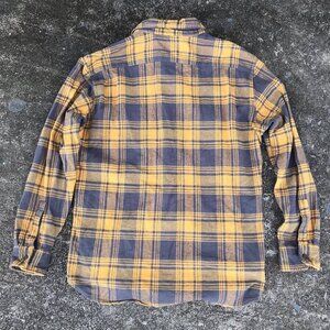 Classic plaid flannel shirt in warm yellow and navy tones. Button-front design with two chest pockets and long sleeves. Made from soft brushed fabric that feels comfortable while still being durable. Perfect for layering over a tee or wearing on its own. Timeless plaid pattern suitable for casual outfits, fall layering, or everyday wear.