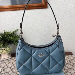 Brand new and never used Coach Teri Diamond Quilted Hobo in Silver Light Mist. Beautiful soft quilted leather with silver-tone hardware. Stored and never carried.