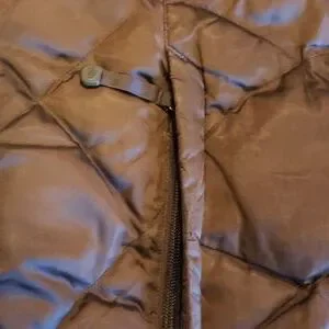 Stylish brown quilted vest. Features full zip front. Embroidered logo on chest.