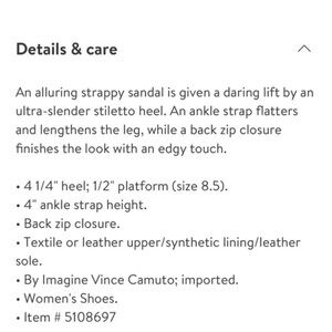 Imagine by Vince Camuto ‘Devin’ heeled sandal. Women’s size 6. Like new condition, worn only once for pictures. Heel height: 4 1/4 “, these are very versatile and can be worn with a cocktail dress or for a wedding shoe or bridal shower, rehearsal dinner etc.