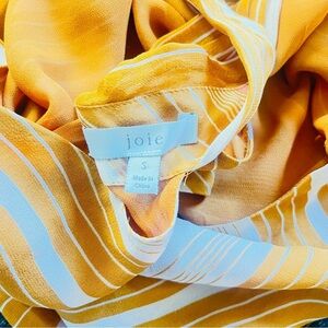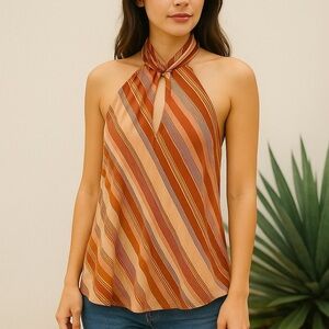 Elevate your wardrobe with this stunning Joie silk halter top in a bold striped pattern. Featuring warm shades of brown, pink, and orange with a flattering keyhole neckline and airy flowy fit. Perfect for summer outings, brunch dates, vacations, or boho chic layering.