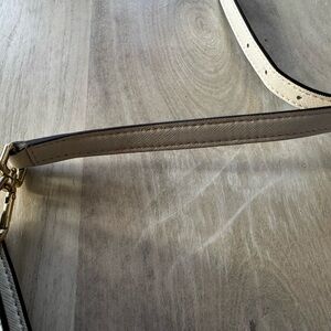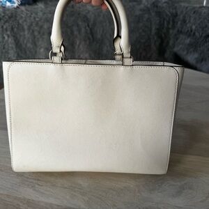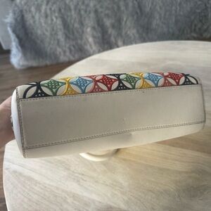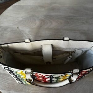 Tory Burch Robinson embroidered small zip tote bag in new ivory saffiano leather with a multi-color embroidered pattern. Paid full price of $428. Does show some minimal wear. The strap is a bit bent from being tucked in purse. Should restore to normal once used for a bit.
