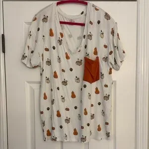 Adorable pumpkin print tee with a bright orange pocket. Perfect for playful outfits.
