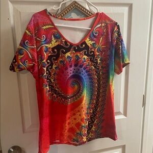Add a splash of color to your wardrobe with this vibrant swirl pattern top. Perfect for casual outings, this top features a stunning mix of red, blue, and yellow hues. A must-have for those who love bold and colorful fashion.