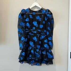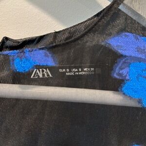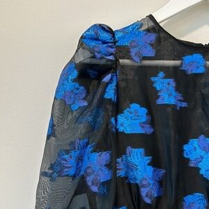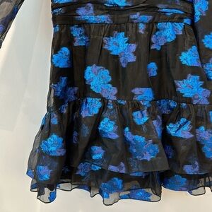 Zara Black Organza Sheer Mini Dress Blue Long Sleeve Tiered Skirt Floral Ruffle