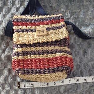 Vintage Tommy Hilfiger mini woven straw/raffia handbag with denim straps. Top handle and crossbody strap. Velcro closure.