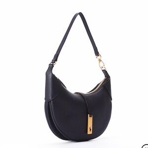 Shoulder strap with an 8.5" maximum drop. Adjustable swivel clasp hooks into two metal D-rings to create a croissant-shaped wristlet silhouette.