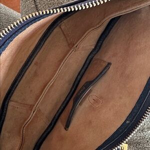 Double pillow gusset construction with piping creates two distinct compartments. Interior card slot. Bonded suede interior.
