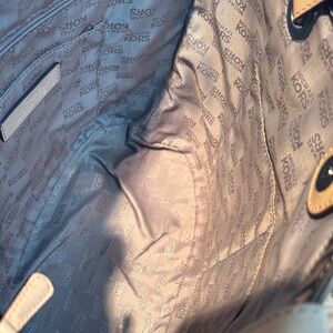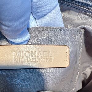 Elegant Michael Kors tote with glossy black finish. Features tan leather straps. Perfect for daily use.