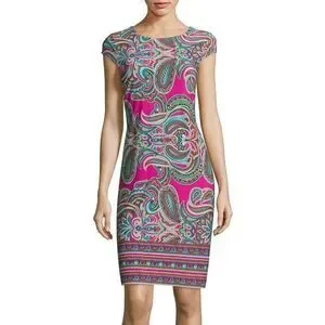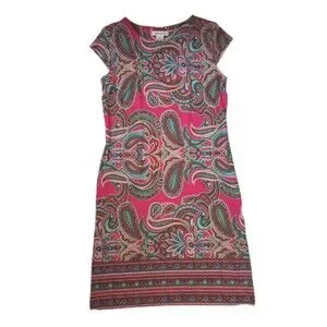 This listing is for a cap sleeve Liz Claiborne pink paisley print knee length dress. Very comfortable and flowy, nice stretch for a more natural fit.