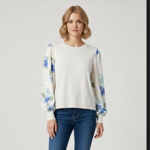 NWT Daniel Rainn Floral Puff Sleeve Mixed Media Sweater