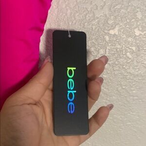 Vibrant fuchsia swimsuit with sparkling Bebe logo. Sleek and stylish design.