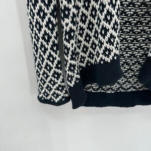 This is a long-sleeve, open front cardigan from Wooden Ships Paola Buendia. Navy and white allover diamond pattern with solid navy trim at cuffs and hem. Dropped shoulder and slight shawl collar.