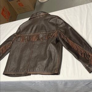 Stylish dark brown leather jacket with fringe details. Features a classic zip-up design. Perfect for adding a unique touch to your wardrobe.