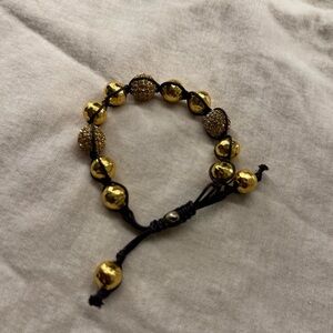 This elegant bracelet showcases polished gold beads beautifully arranged on a sleek black cord. The adjustable sliding knot closure offers a comfortable fit, making it a versatile accessory for any occasion.